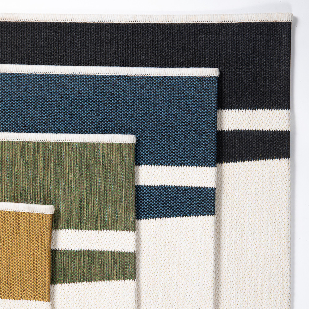 Décliné en quatre coloris tendance (noir, vert, ocre et bleu) et disponible en trois formats (160 x 230 cm, 206 x 290 cm, 246 x 340 cm) ainsi qu’en sur-mesure, ce tapis tendance s’adapte à tous les styles de décoration. Pour accentuer son effet graphique, associez-le à du mobilier en métal, des textiles outdoor naturels et quelques plantes pour créer une ambiance contemporaine et vivante.