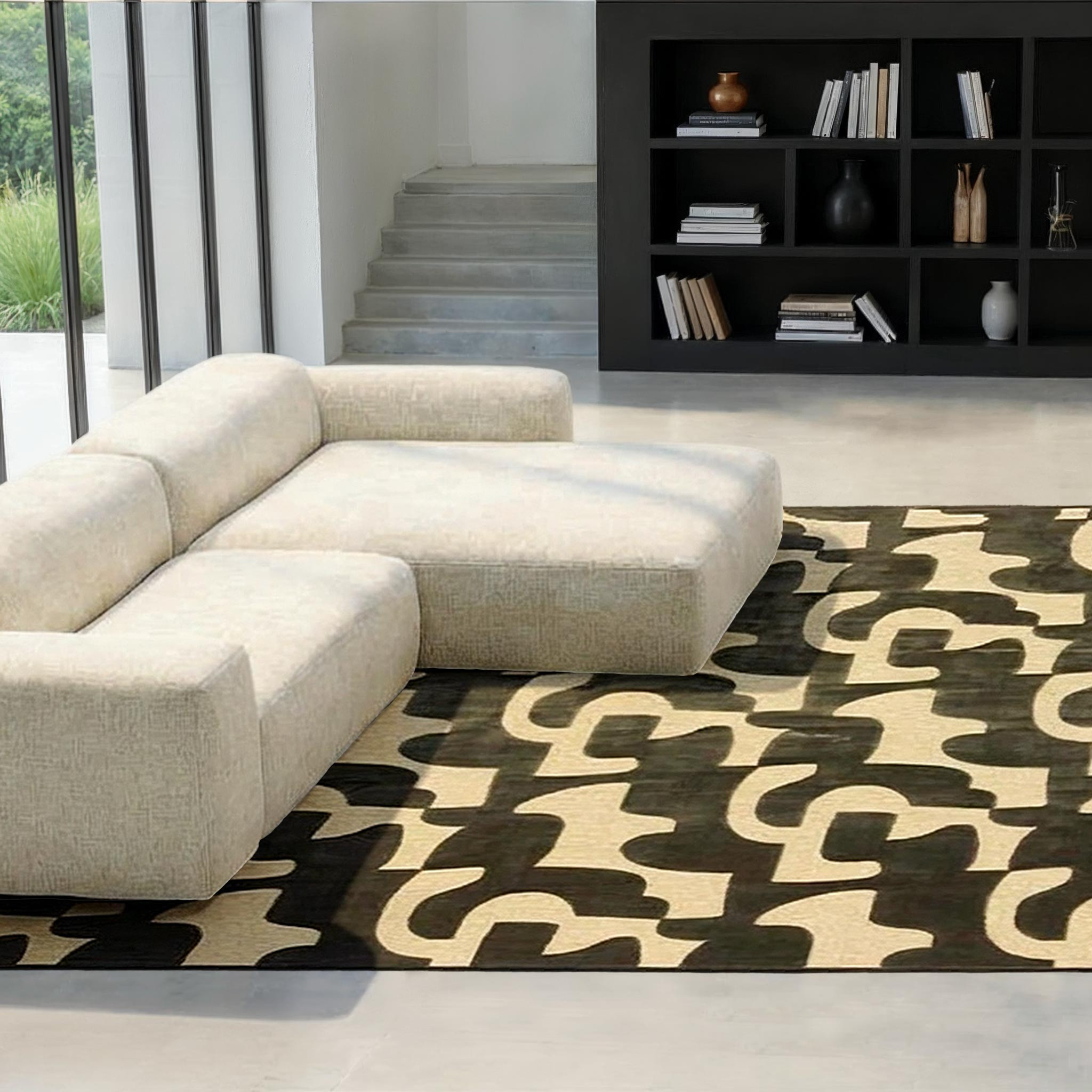 Pour mettre en valeur ce tapis design, optez pour du mobilier aux lignes épurées et aux teintes naturelles. Des coussins aux motifs géométriques ou des pièces d'art abstraites peuvent également compléter parfaitement le style moderne du tapis.